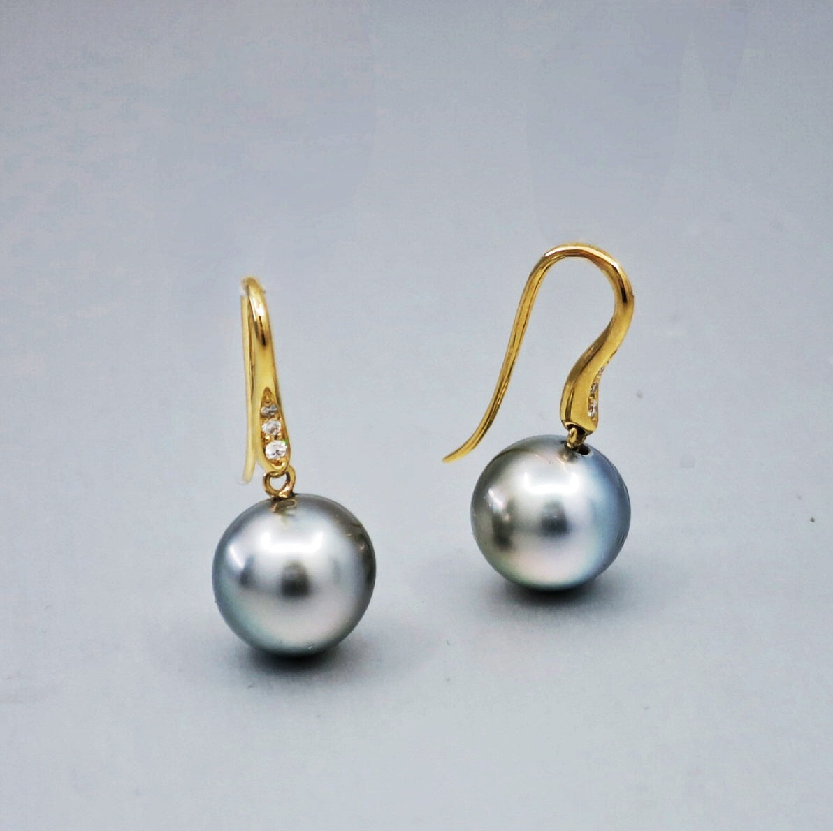 A pair of BUNDA 'Vine' Cultured Tahitian pearl earrings in 18 carat white gold, featuring drop shaped pearls of clean skin and excellent lustre, platinum grey in colour, with diamond set hook fittings.