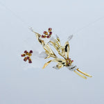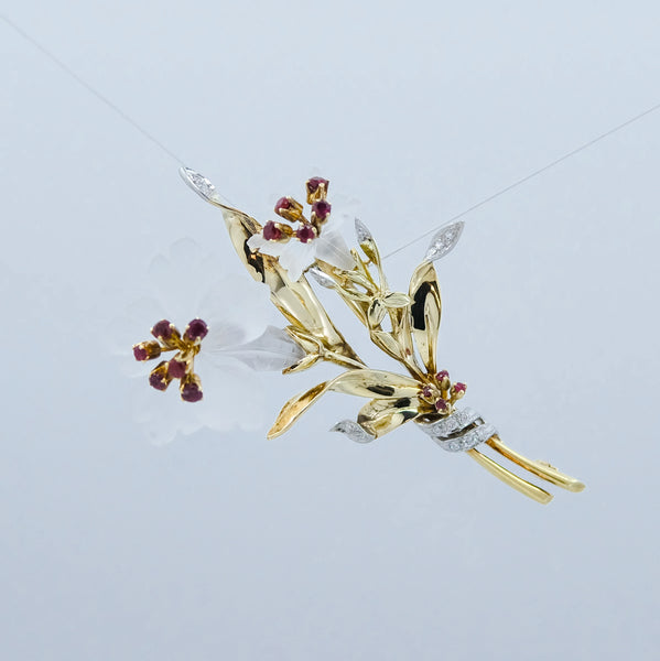 A platinum and 14 yellow gold brooch, featuring flowers, with rock crystal for the petals and rubies for the pistil and diamond finish. Weight 20.29grams. Estate piece.