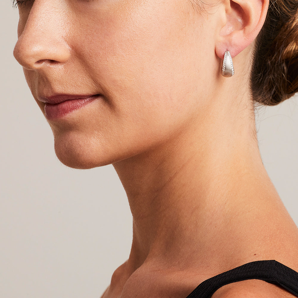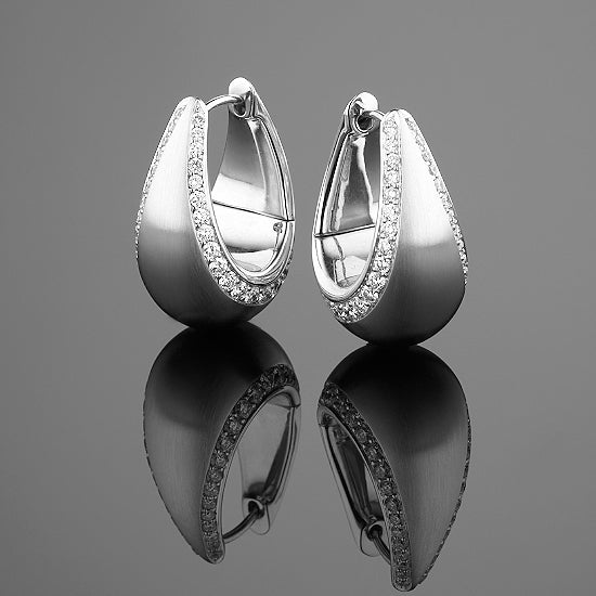 A pair of BUNDA 'Bundova' Diamond clip earrings in 18ct white gold. Each earring is thread-set with round brilliant diamonds along the edges. Earrings have a brushed finish.