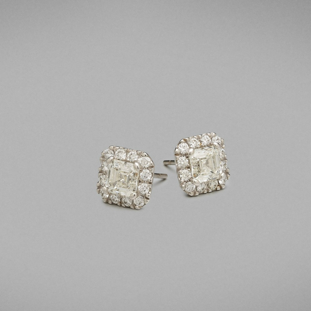 A pair of BUNDA 'Valentin' diamond earrings in White Gold. Each earring is set with an asscher cut diamond in a four claw setting, with round brilliant diamonds castle-set to the head. Fittings are post and butterfly in White Gold - Butterflies are stamped, 'BUNDA'.