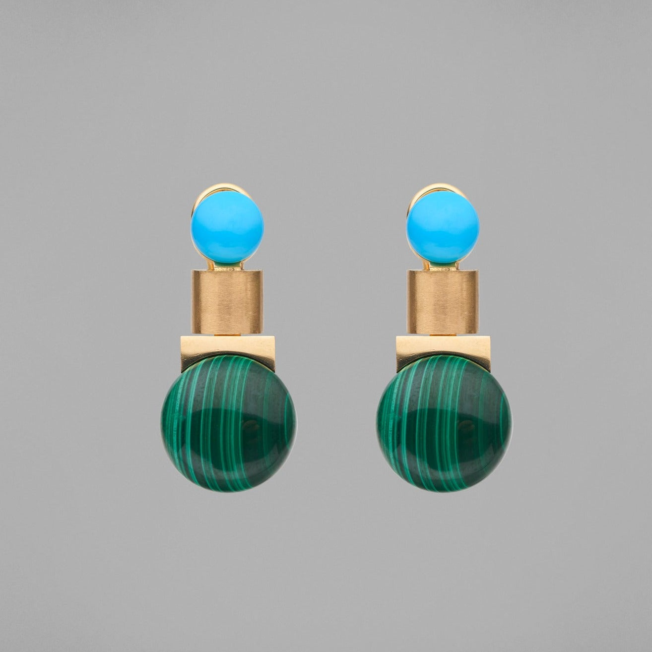 BUNDA 'Dorado' turquoise and malachite earrings handcrafted in 18ct yellow gold for 'Future BUNDA' Collection 2022. Combining bright polish and satin matt finish each articulated gold element brings the rich colours of fine turquoise and malachite to life.