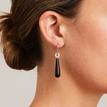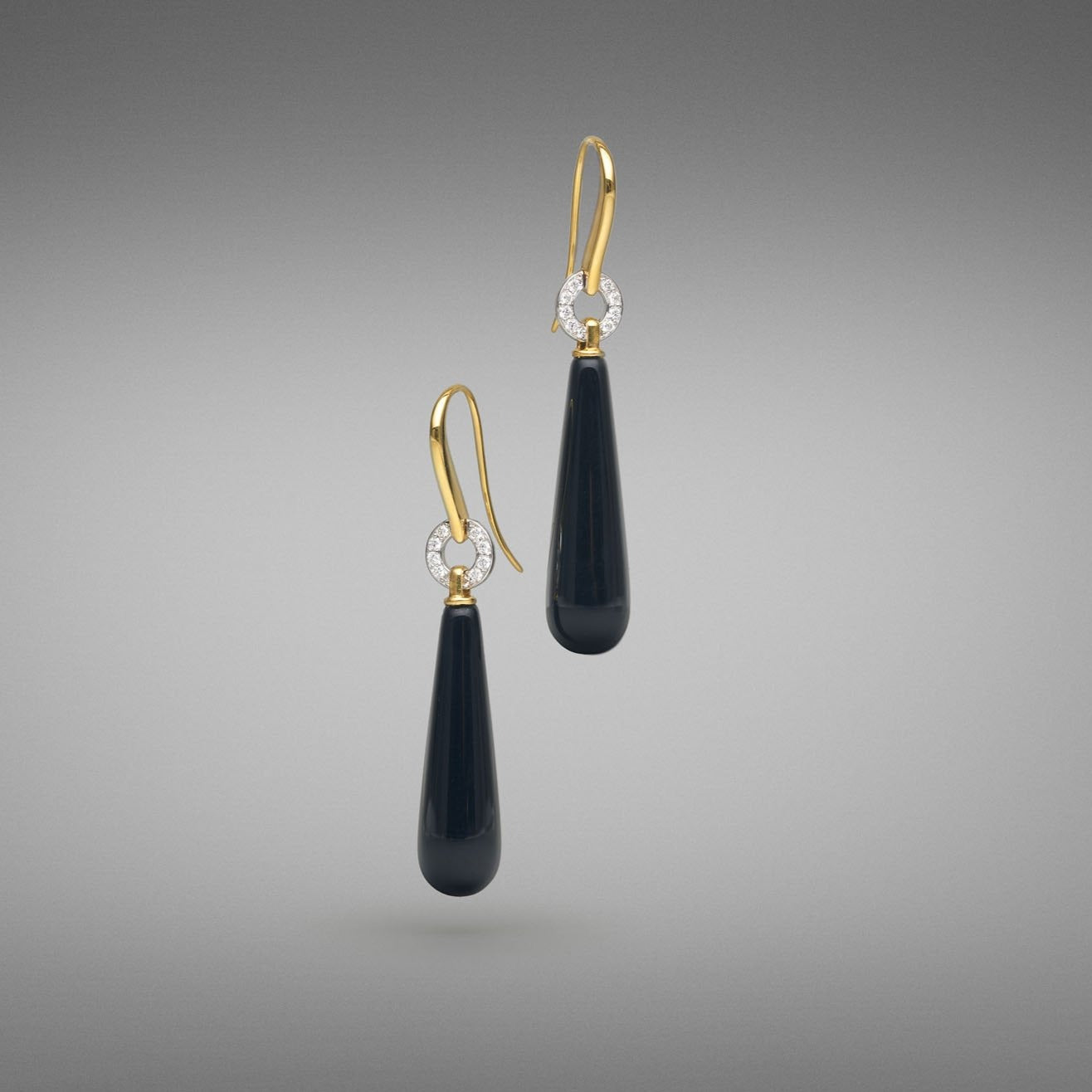 Each earring is set with a 10.00ct onyx smooth briolette suspended from an 18ct yellow gold hook with an 18ct white gold rondelle, thread-set with round brilliant diamonds.