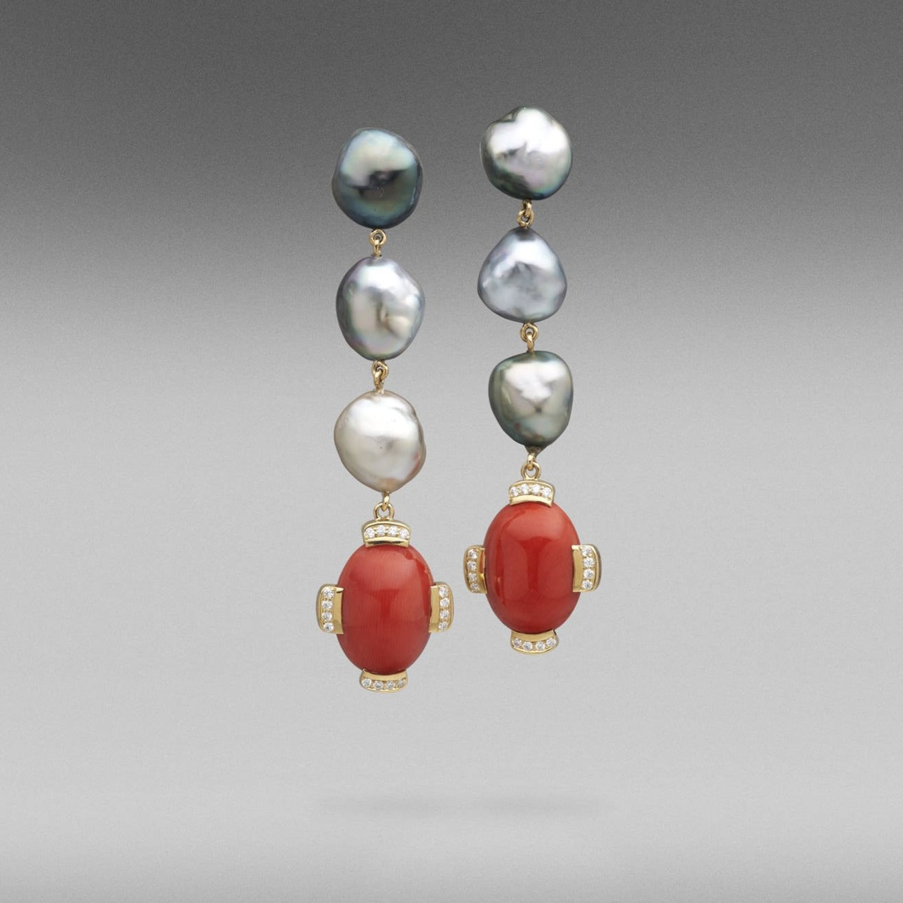 Enquire About the 'Krest' Tahitian Keshi Pearl & Precious Coral & Diamond Earrings