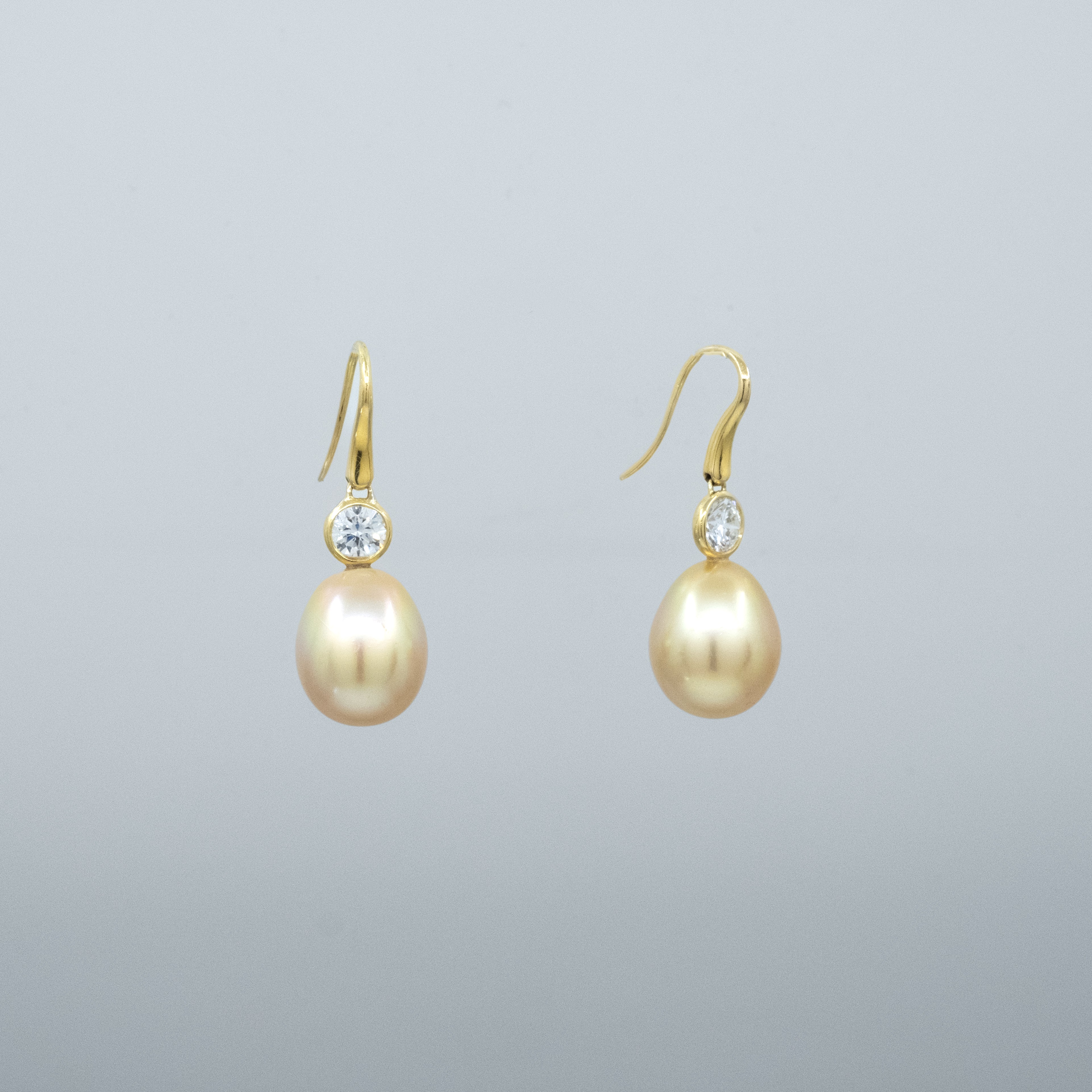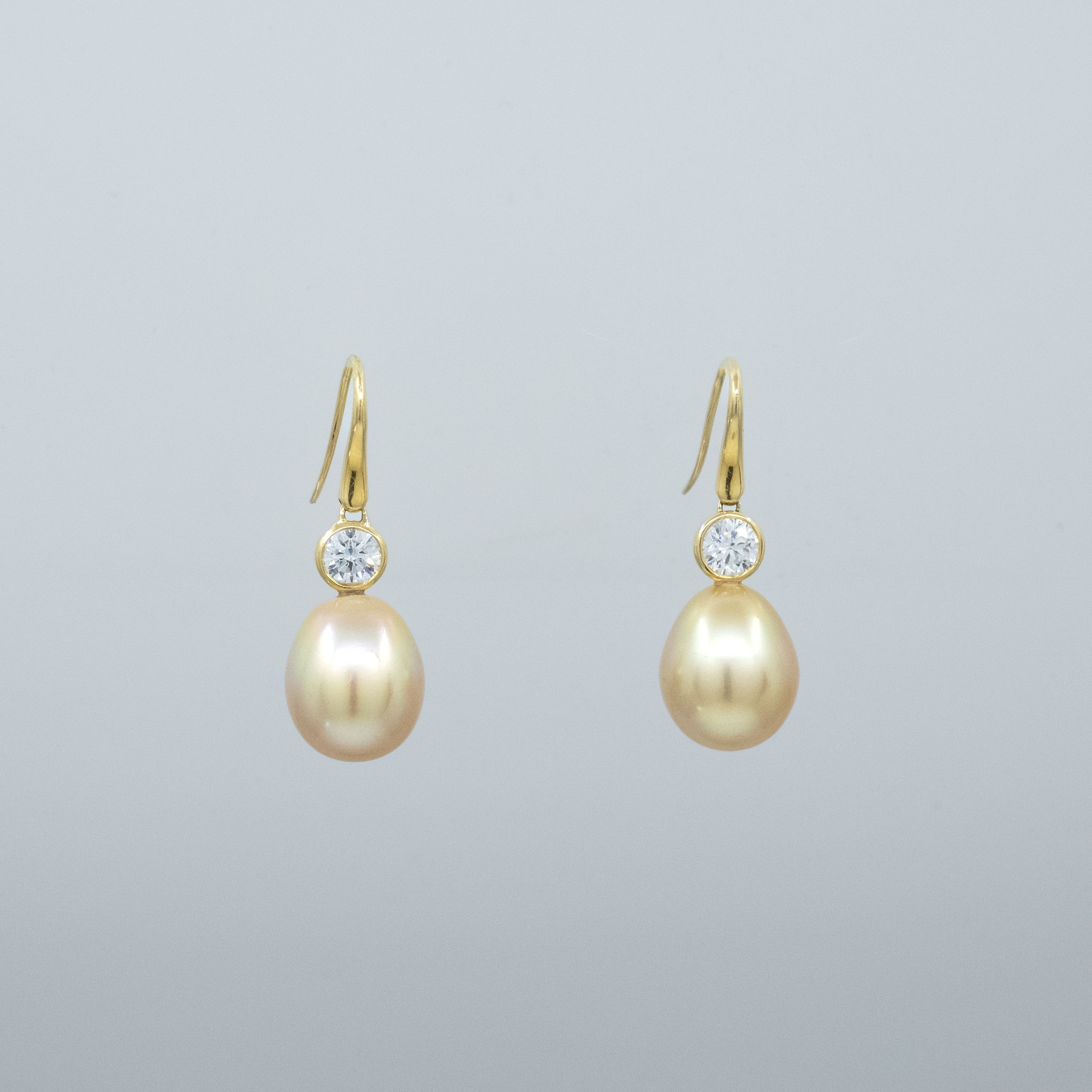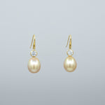 A pair of BUNDA 'Seren' Australian Golden South Sea pearl earrings made in 18 carat yellow gold with round brilliant cut BHP Billiton diamonds, set with drop-shaped pearls, of clean skin and excellent lustre, gold in colour.