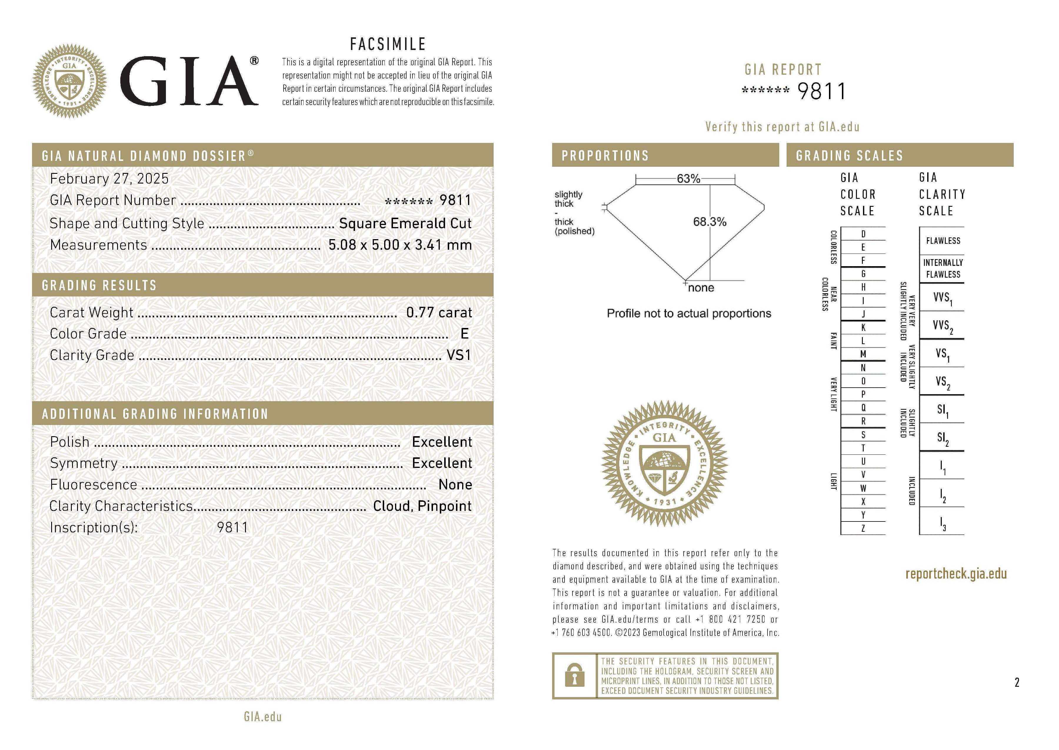 This ring features an Asscher cut Diamond of 0.77ct, E colour and VS1 clarity, with a GIA certificate.