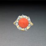 A BUNDA 'Lyra' natural red coral and diamond ring. This ring features a round-shaped cabochon red coral of 3.39 carats and round brilliant cut diamonds in 18ct white and yellow gold.