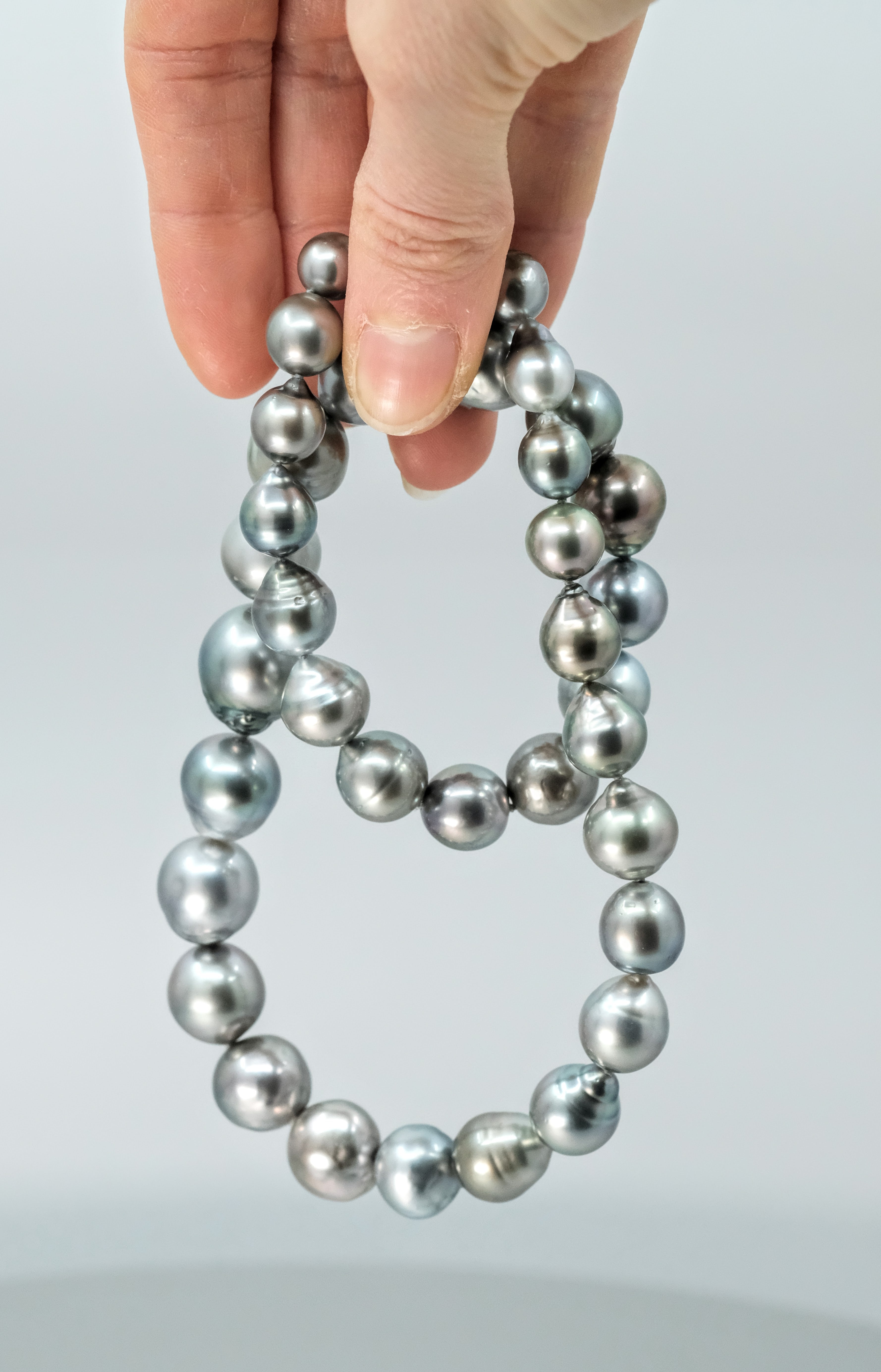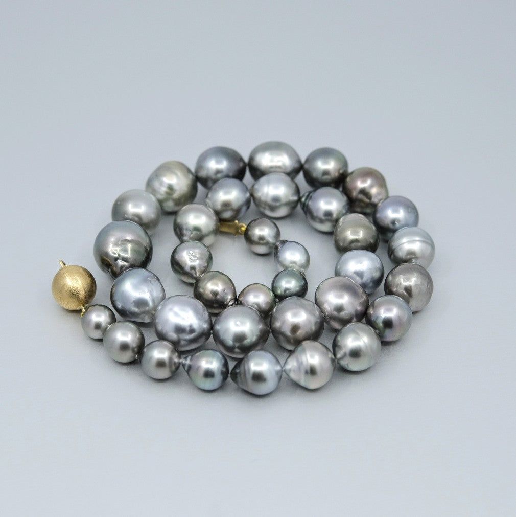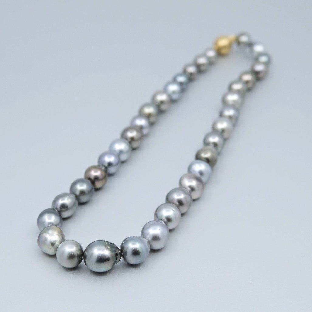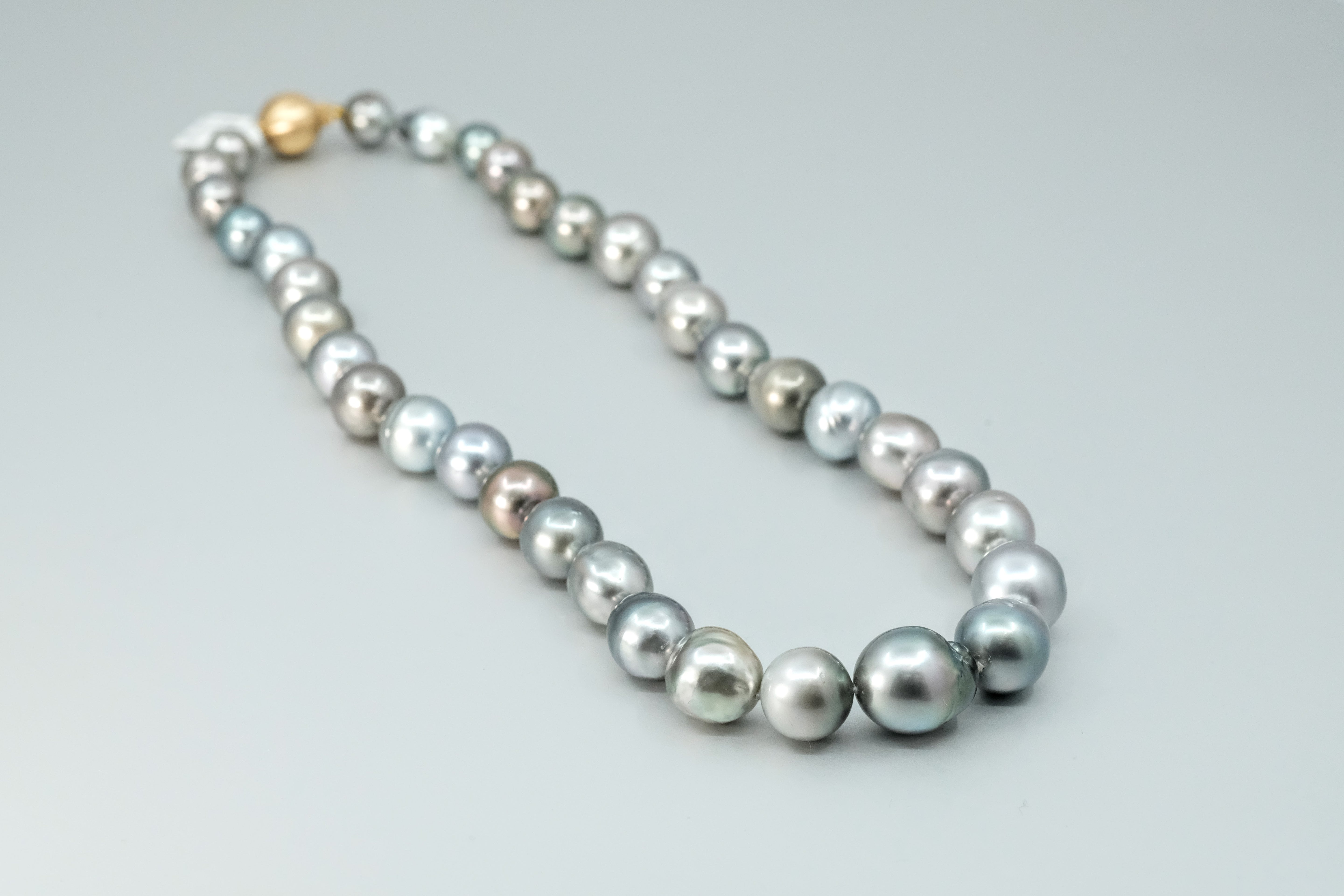 with an 18 carat yellow gold clasp. The 35 pearls range in size from 8mm up to 14.5mm, featuring colours of blue, grey, pink, green, purple, and have a clean skin and an excellent lustre.