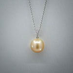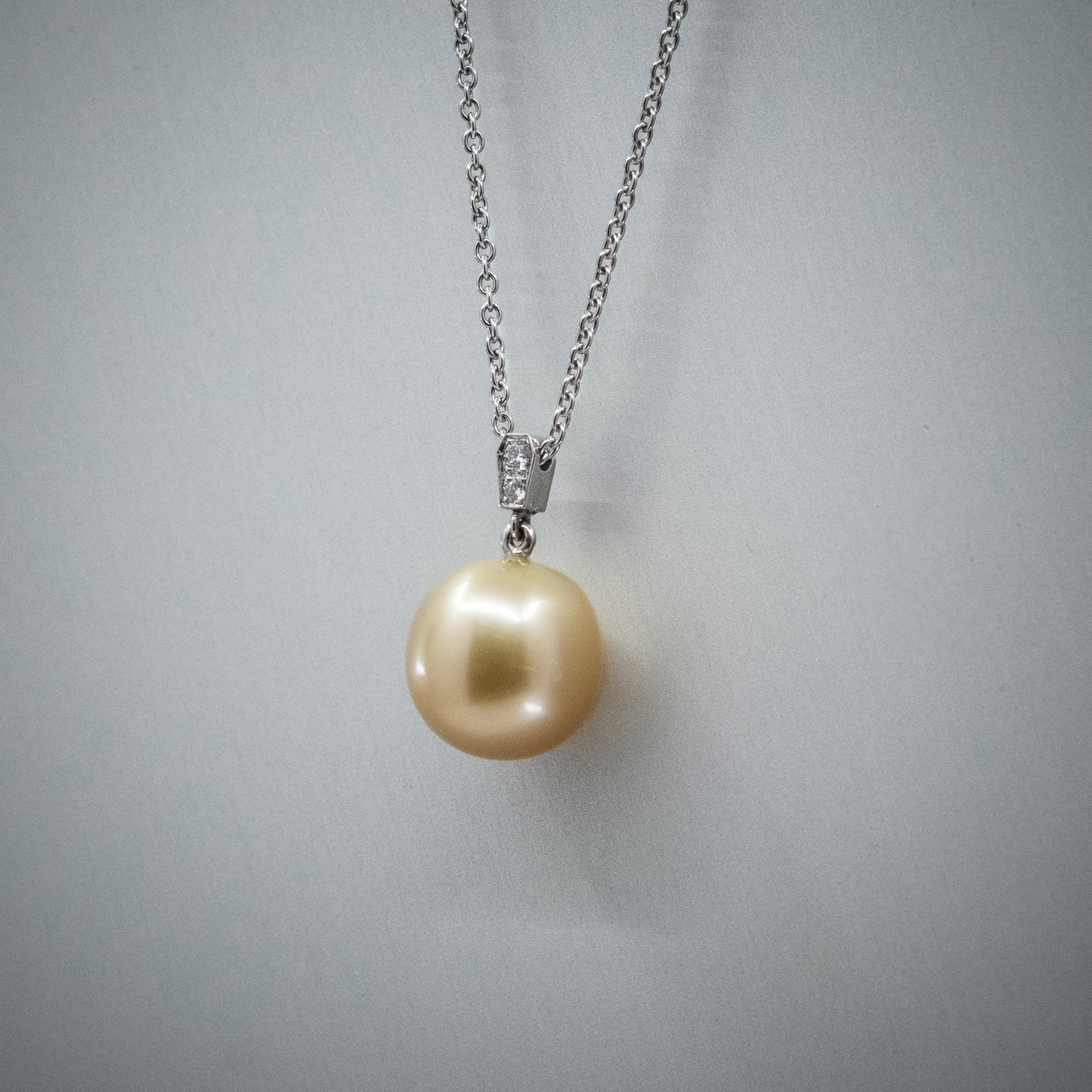 A BUNDA Cultured South Sea pearl and diamond 'Russe' pendant in 18 carat white gold, featuring a slight drop shaped golden pearl of clean skin and excellent lustre.