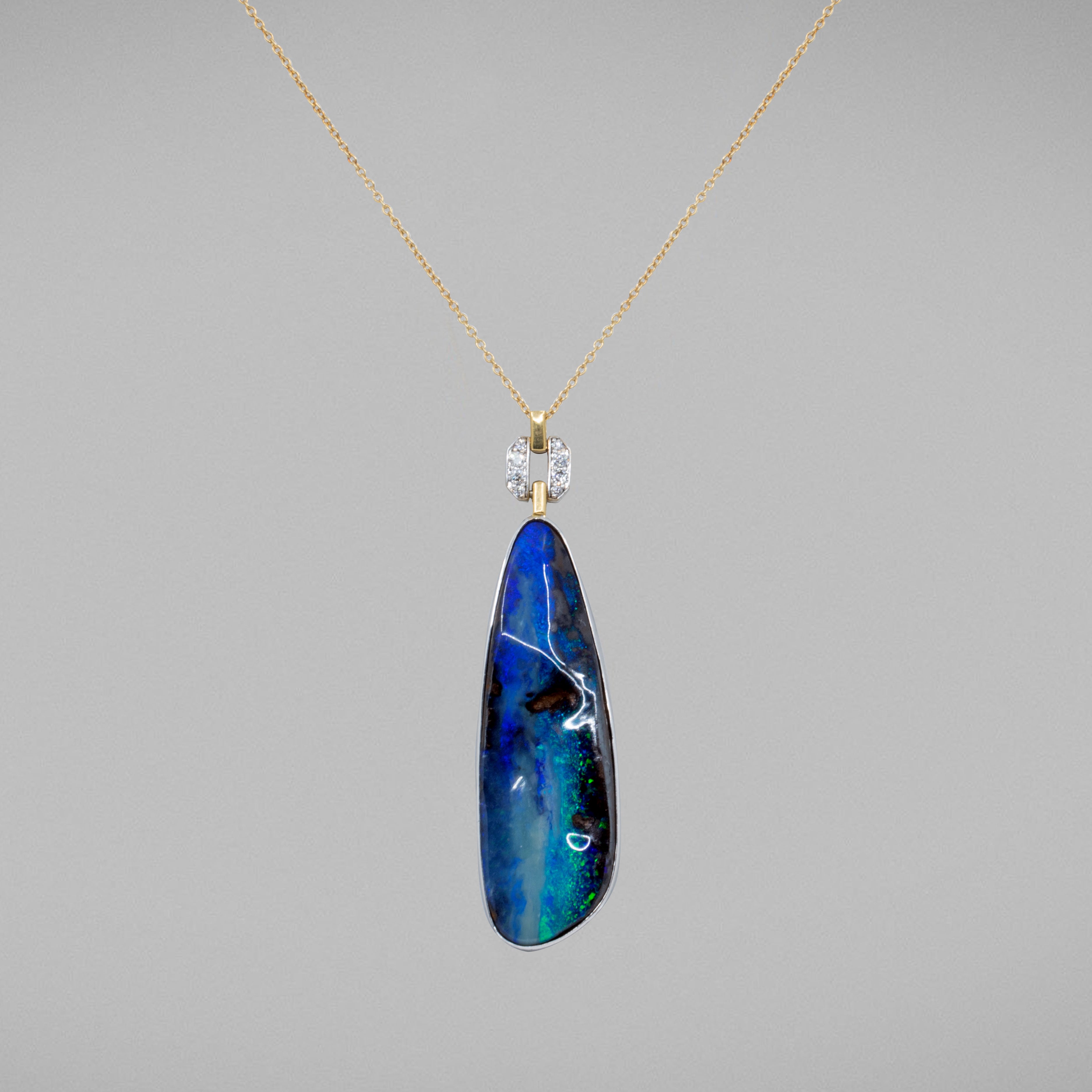 A BUNDA Square 'Hollywood' Australian Boulder Opal pendant, handcrafted in 18ct white gold and 18ct yellow gold, on an 18ct white gold trace chain. The Boulder opal is set within a frame and fitted below a square thread set with round brilliant cut diamonds, it is predominantly blue and green in colour and weighs 26.26ct.