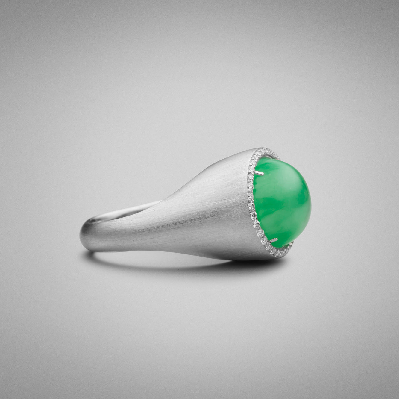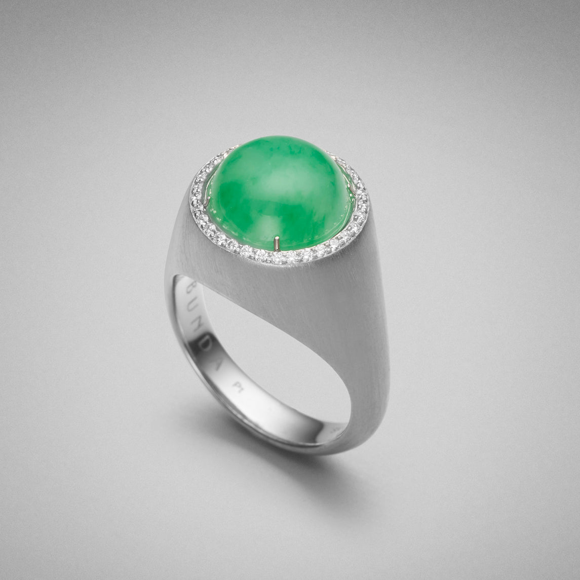 A BUNDA 'Corvus' Jade Ring, featuring a cabochon cut Jade of 4.75ct, enhanced with diamonds totalling 0.15ct, made in platinum.