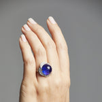 A BUNDA 'Couture' tanzanite and diamond ring in platinum, featuring a cabochon cut tanzanite, surrounded with round brilliant cut diamonds, pave set into the surrounding petals.