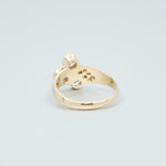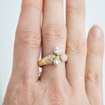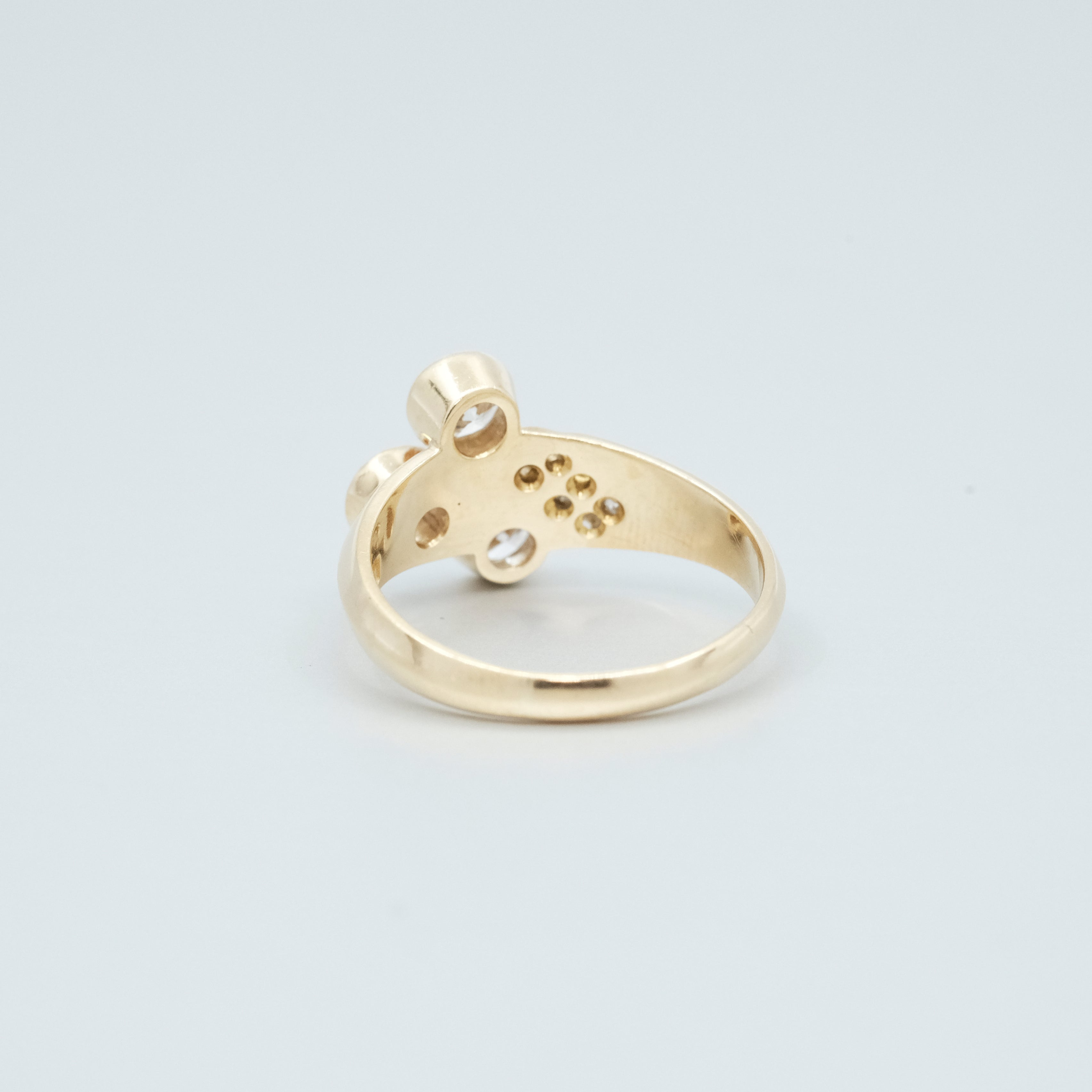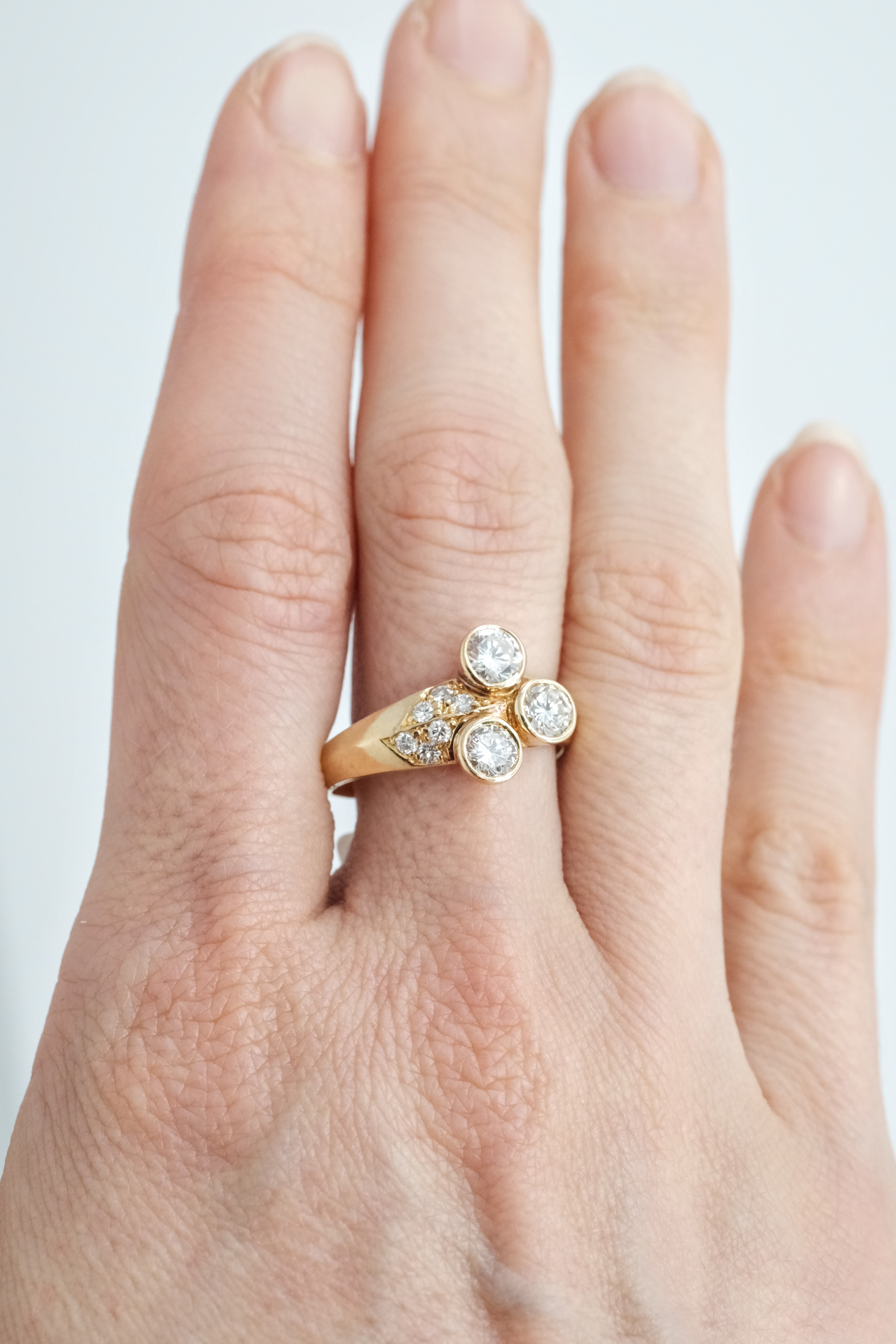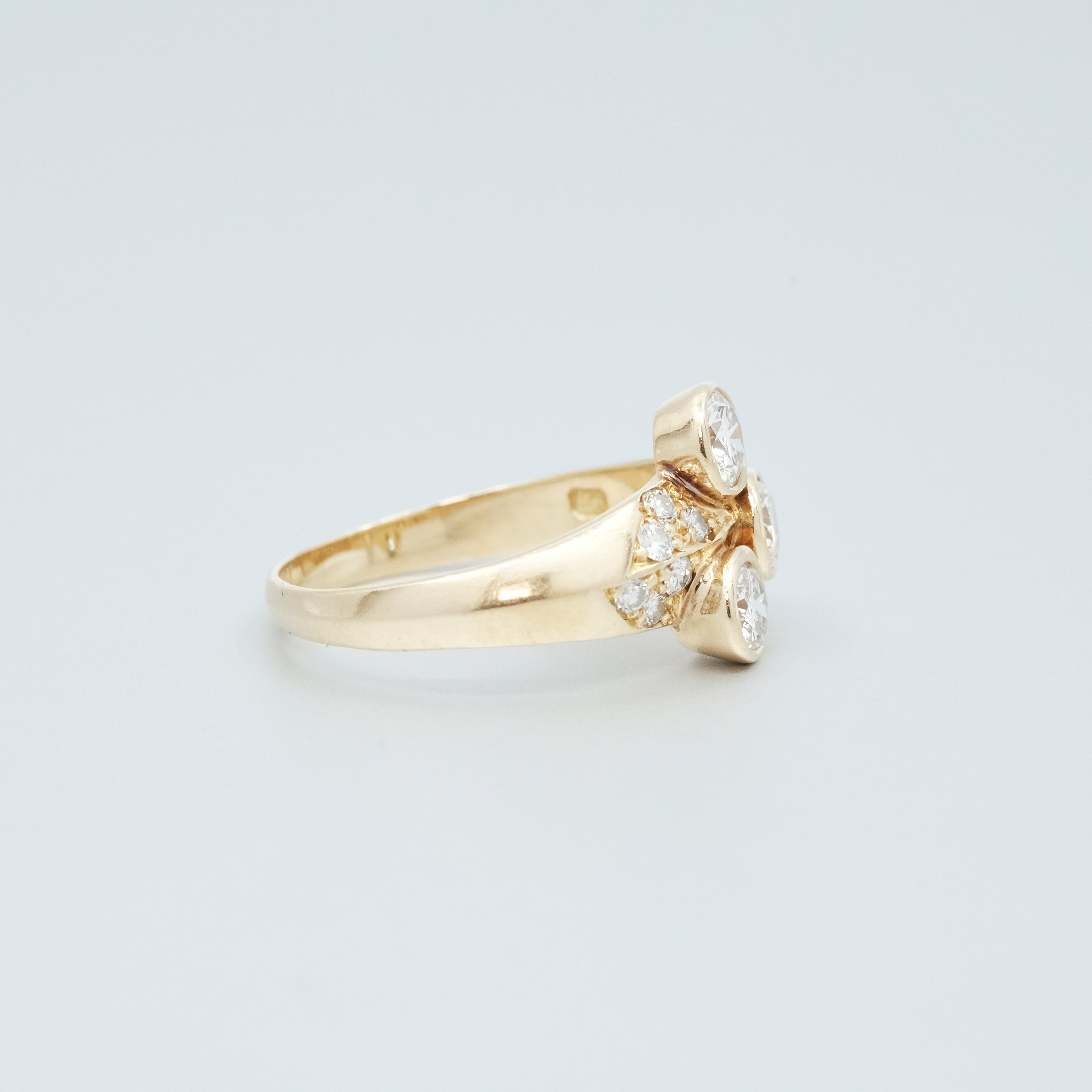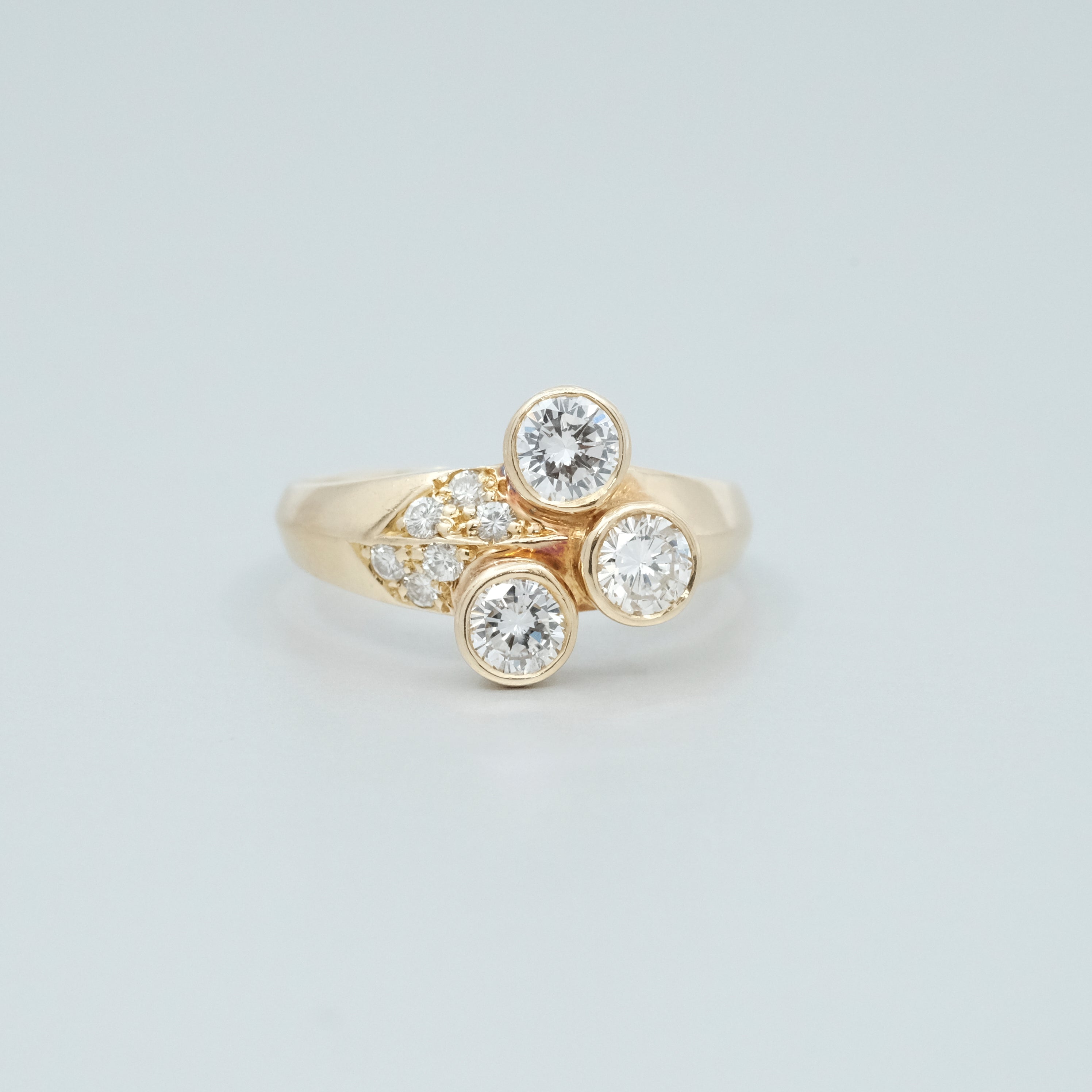 A Diamond ring, featuring three brilliant cut Diamonds totalling approximately 1.08cts (Estimated grading G SI) and six brilliant cut diamonds totalling approximately 0.06ct. 18ct yellow gold. Ring size P. Weight 5.43 grams. Estate Jewellery.