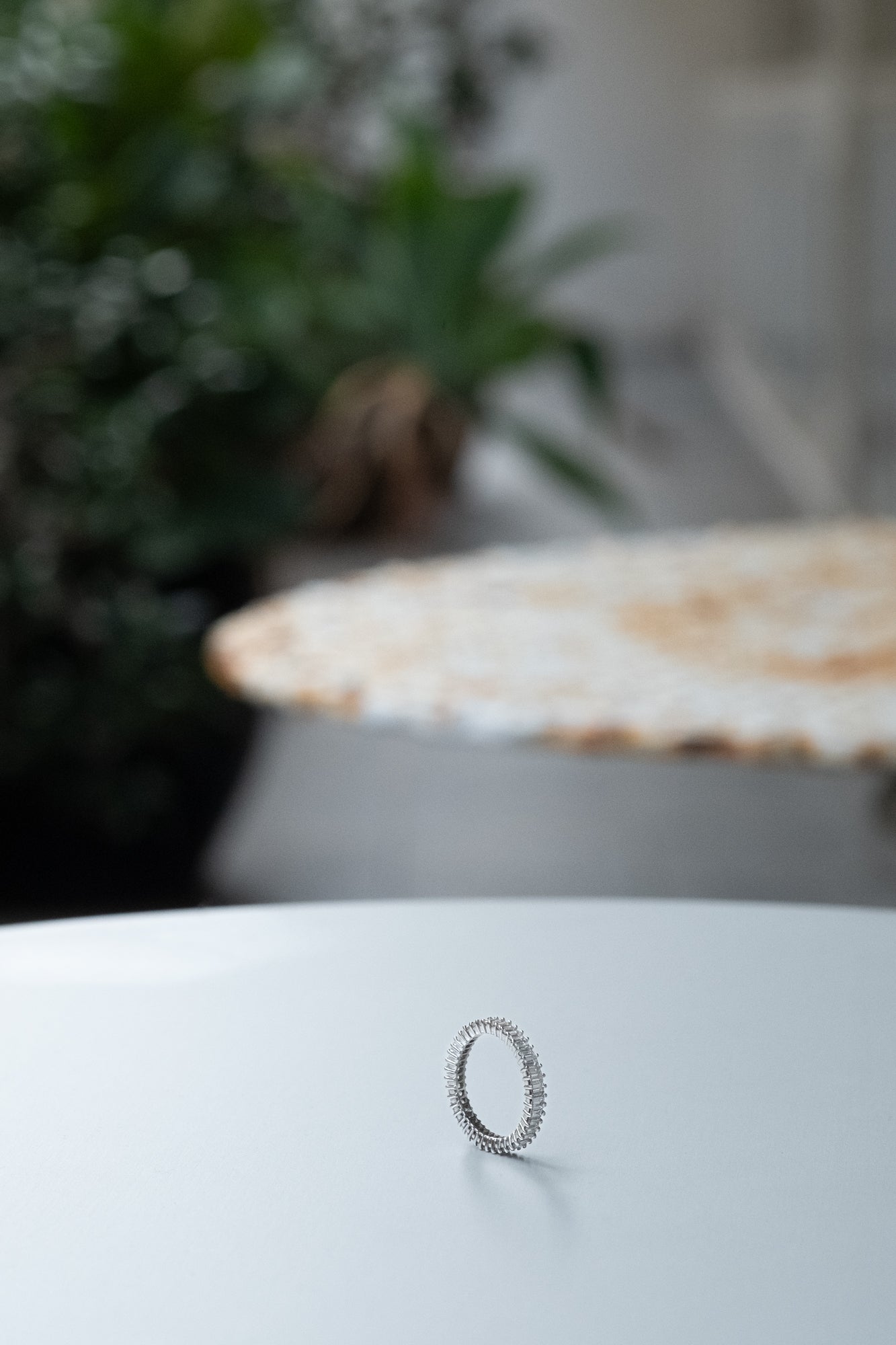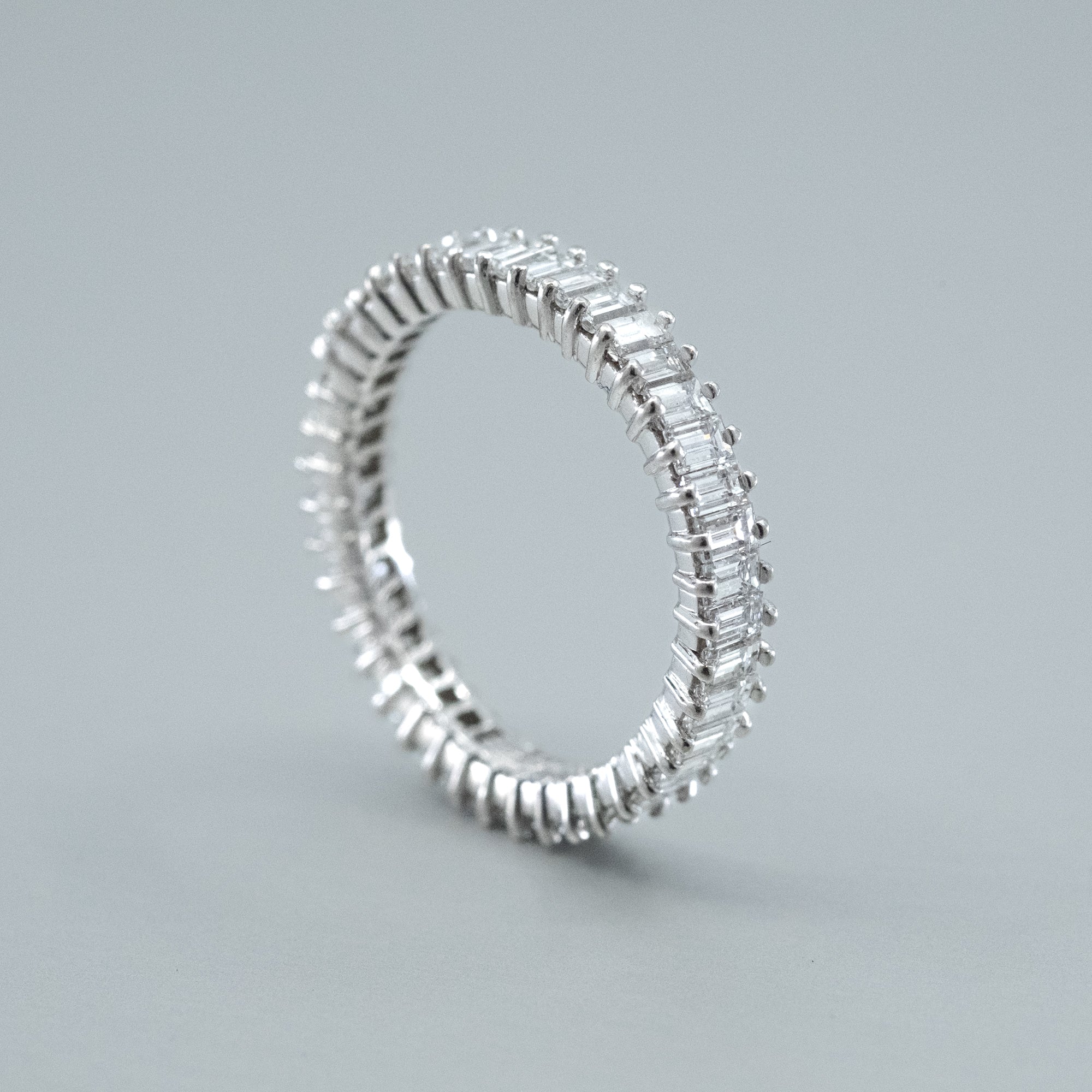 A Bunda Saturn Wire setting Diamond eternity ring, featuring baguette cut Diamonds in platinum. Signed Bunda.