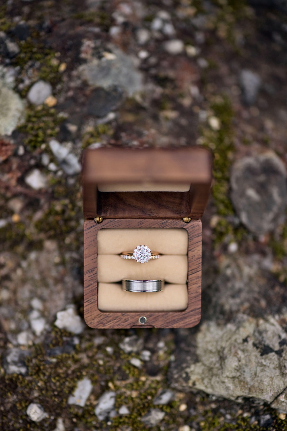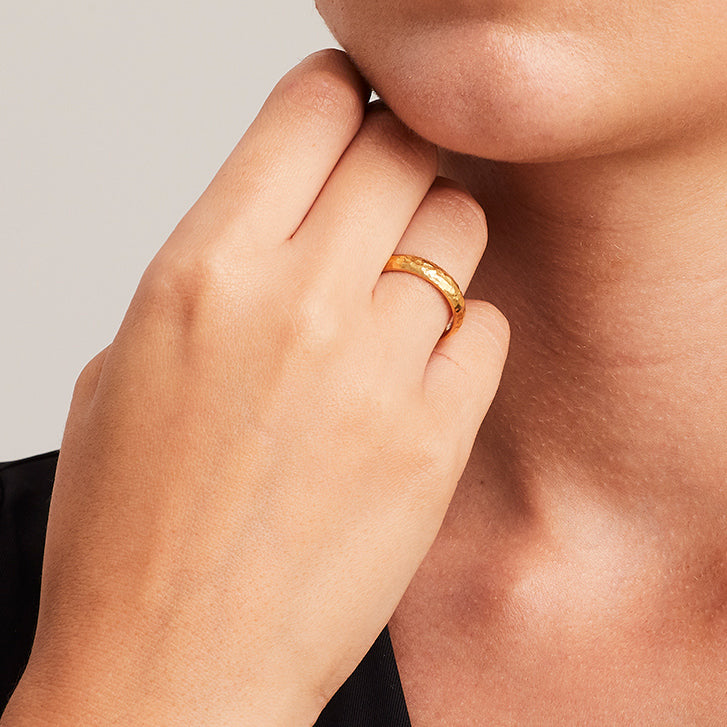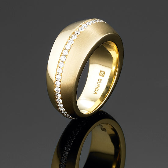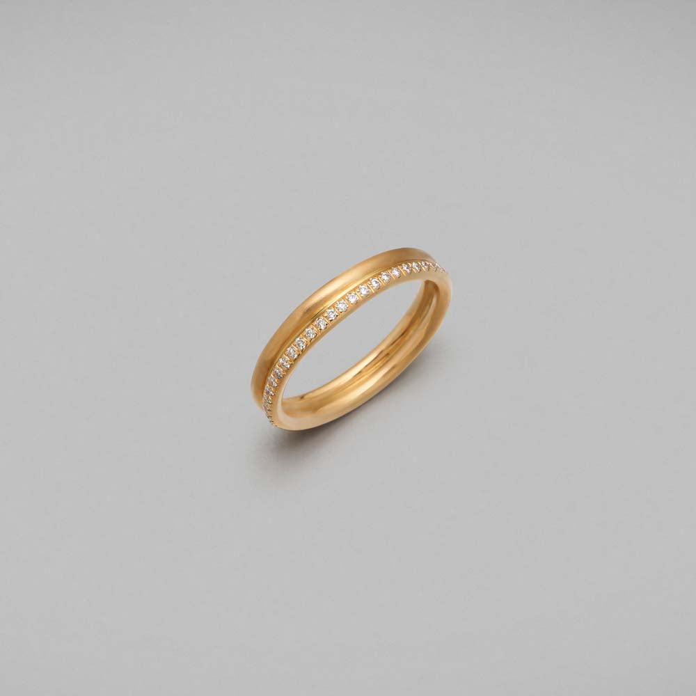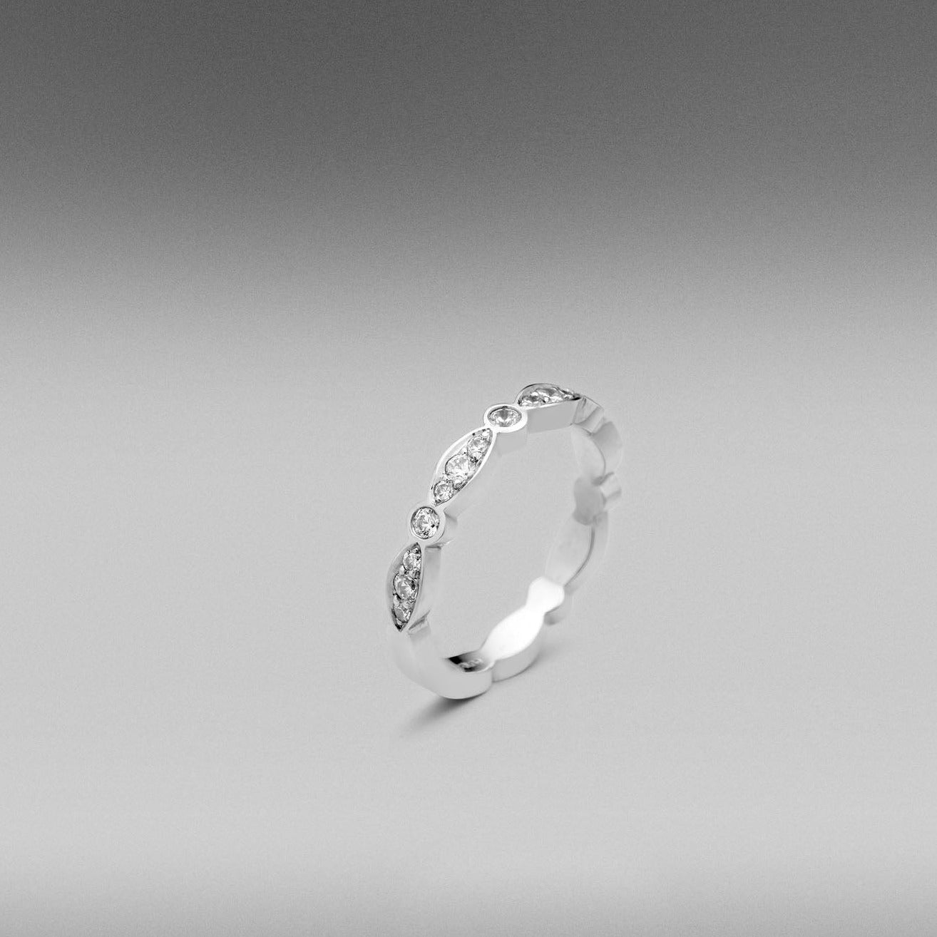 WEDDING RING: Traditionally exchanged during the wedding ceremony, symbolizing the formalization of the marriage commitment. Can vary greatly, from simple bands of metal to those with small accent diamonds. Often designed to complement the engagement ring. Characterized by a continuous line of diamonds or other gemstones encircling the entire band or a portion of it.