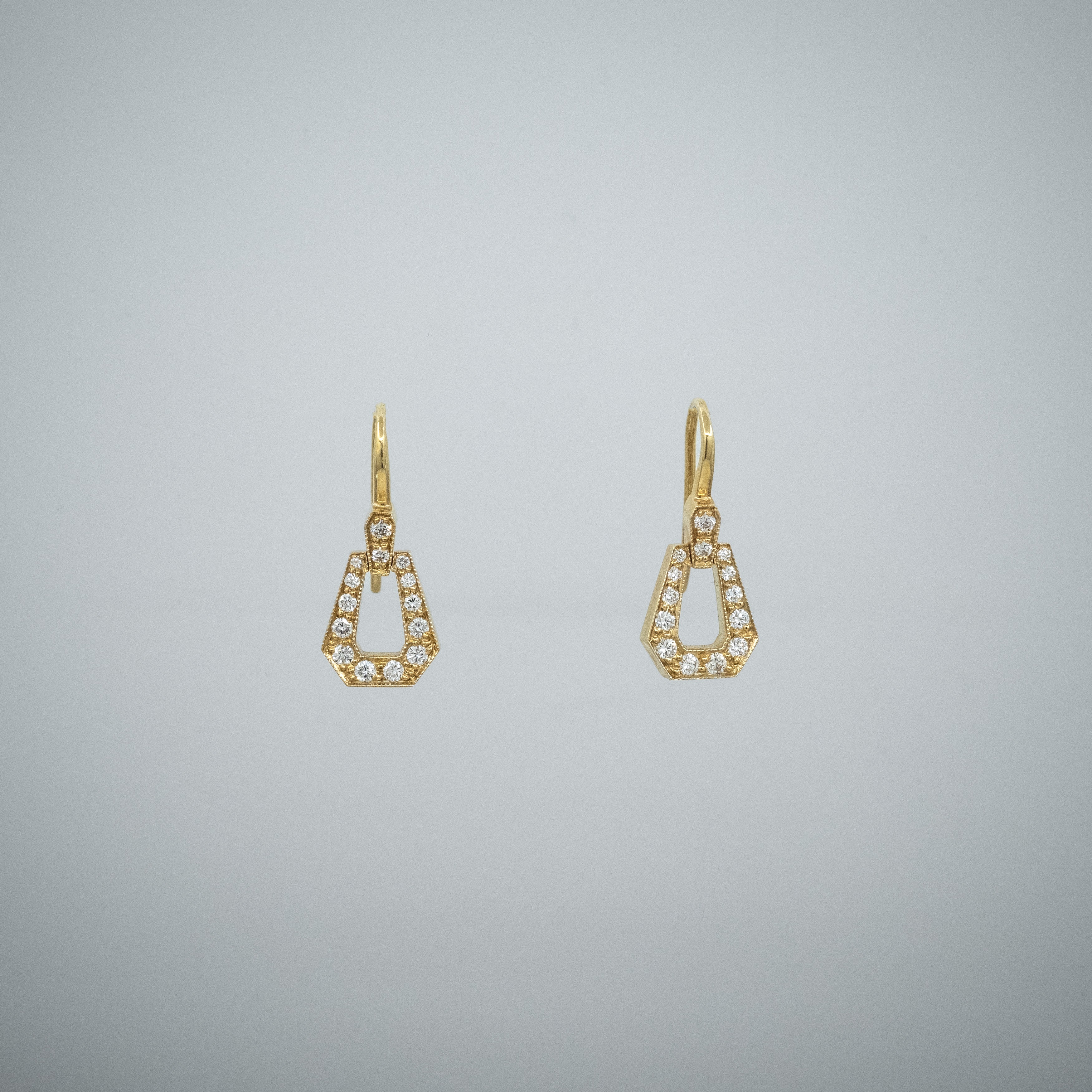 A pair of BUNDA 'Russe' diamond drop earrings in 18 carat yellow gold, featuring threadset round brilliant cut diamonds, with a millegrain finish.