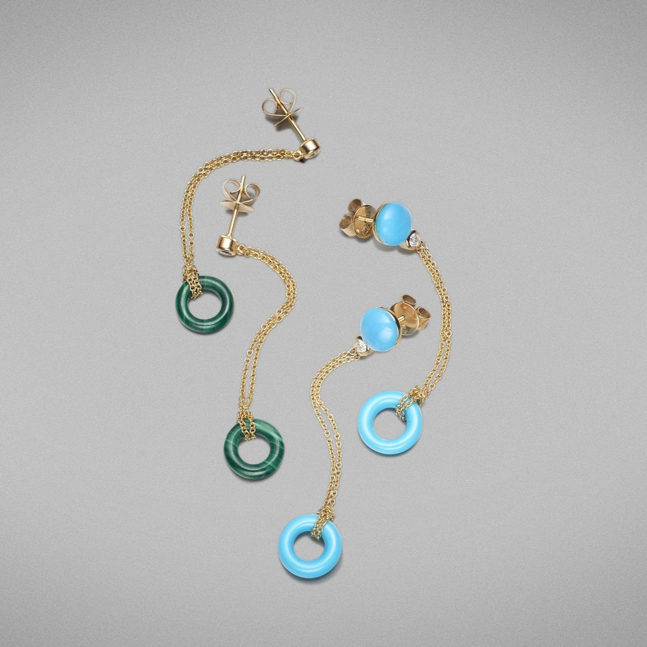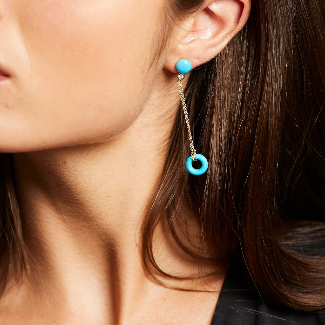 A pair of BUNDA 'Bundova' earrings in 18ct yellow gold. Each earring is set with a round cabochon and a loop of natural turquoise of the finest blue colour. A round brilliant diamond is bezel set under each turquoise cabochon. Loops are suspended from fine 18ct yellow gold trace chain. Fittings are post and butterfly in 18ct yellow gold.