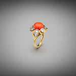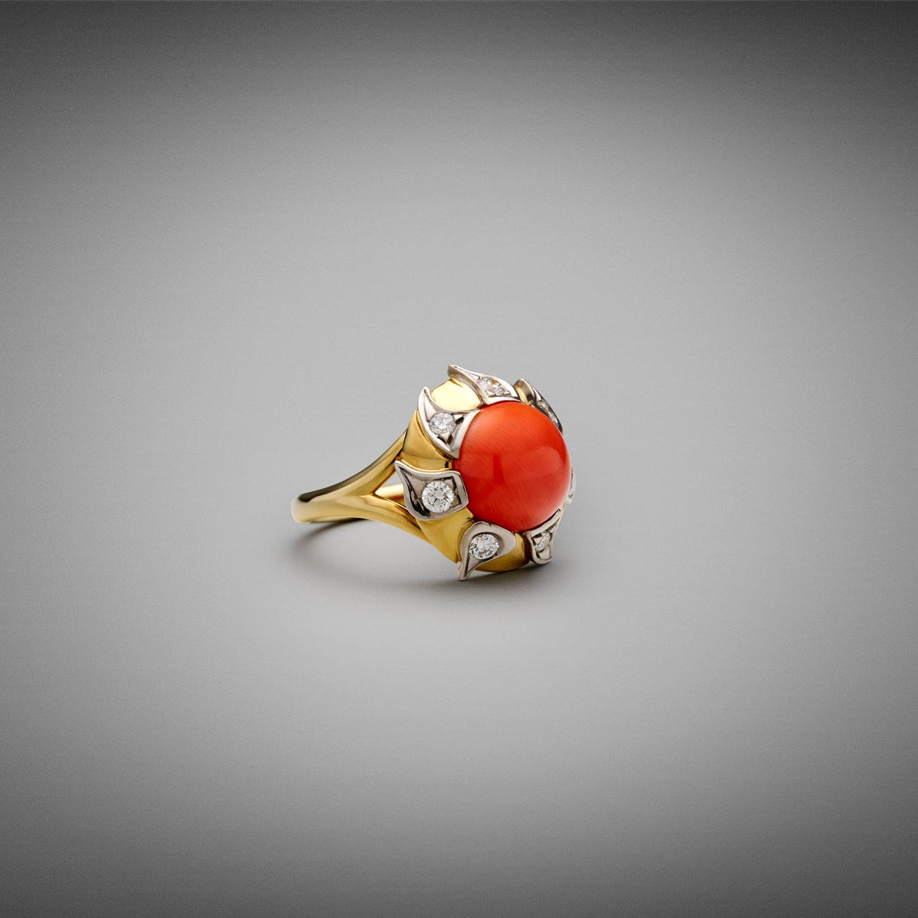 A BUNDA 'Lyra' natural red coral and diamond ring. This ring features a round-shaped cabochon red coral of 3.39 carats and round brilliant cut diamonds in 18ct white and yellow gold.