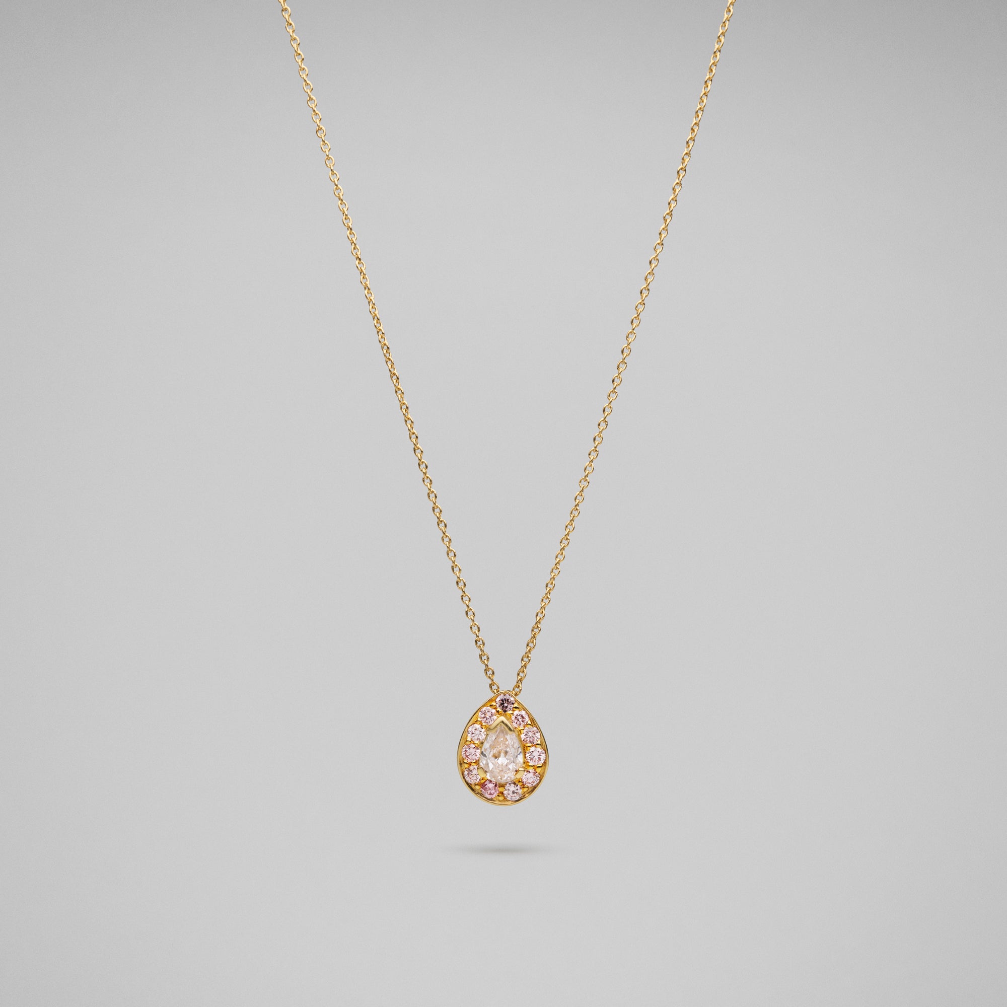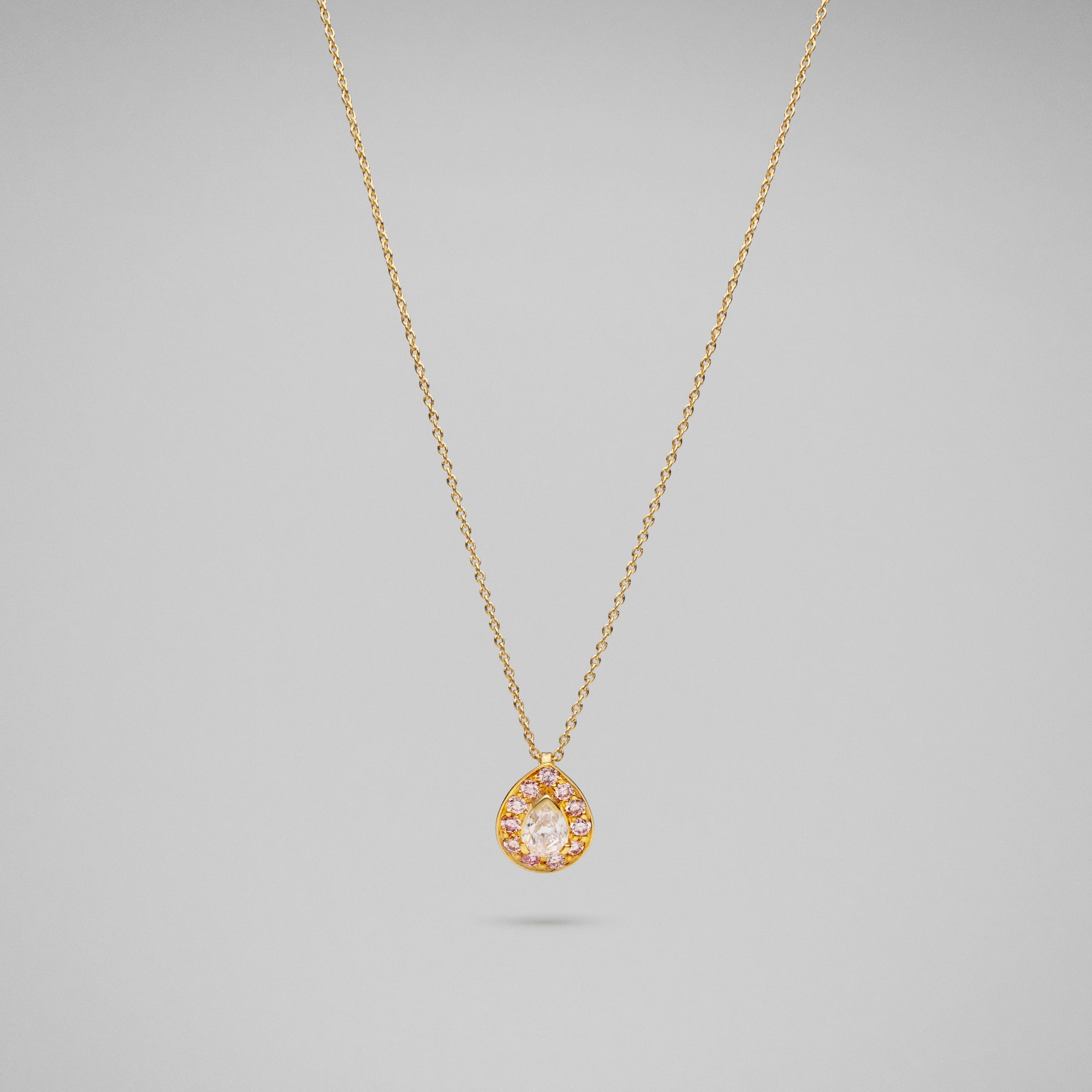 A BUNDA 'Sitara' diamond pendant made in 18 carat yellow gold, featuring a four claw set, pear cut pink diamond, surrounded with threadset, pink diamonds to the head.